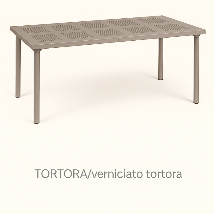 Description: Extendable outdoor table in polypropylene; the design evokes traditional wrought iron furniture. The top is decorated with a repeating pattern of small perforations. Round section legs, affixed to the top with a simple screw system.